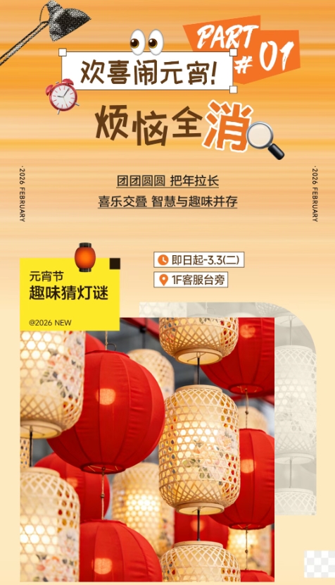 新光天地蘇州:新光天地蘇州推出趣味猜燈謎活動,歡喜鬧元宵?,F場猜中謎底即可領取新年精美禮品。本次元宵節恰逢周二會員日,商場同步開啟會員限量搶購活動。