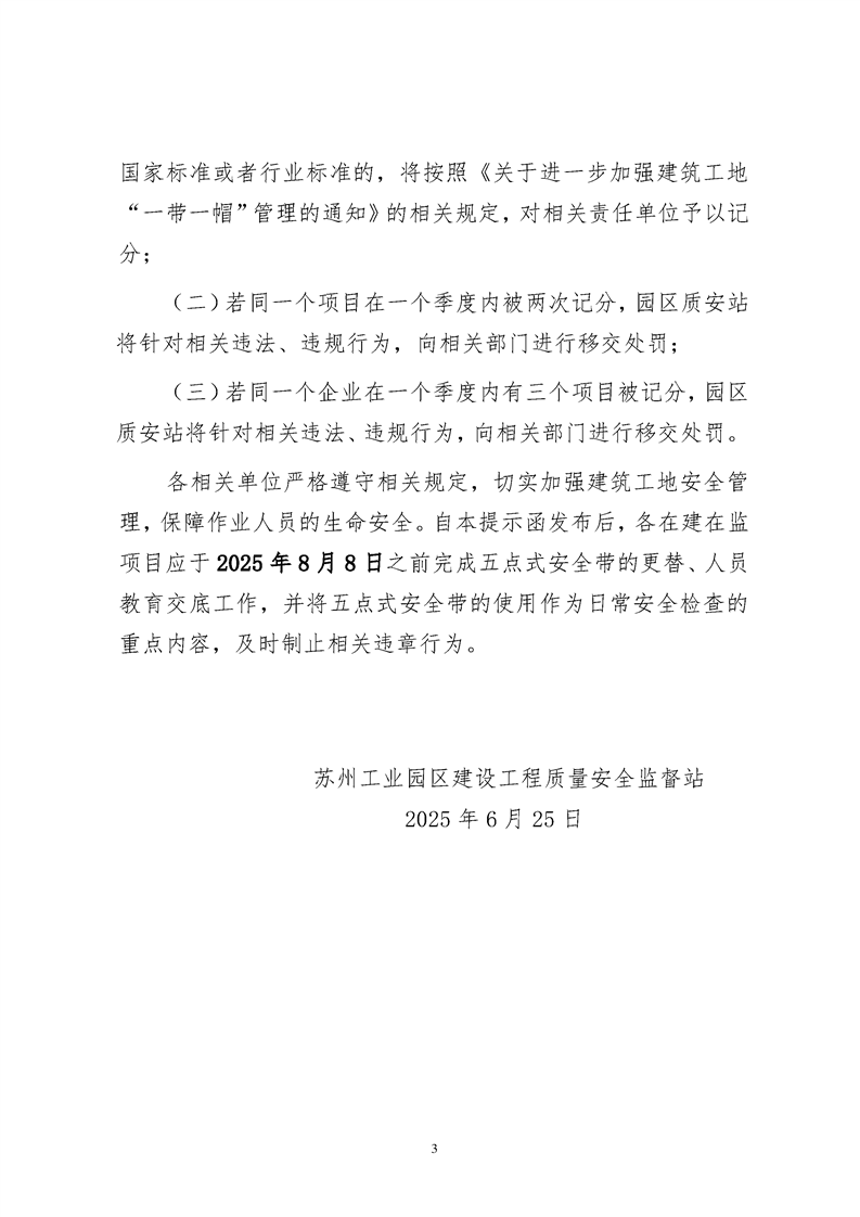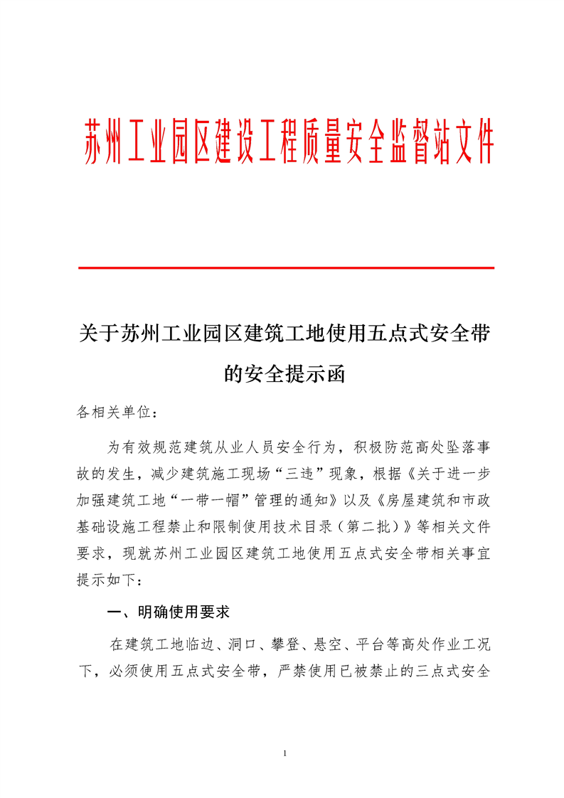 關于蘇州工業園區建筑工地使用五點式安全帶的安全提示函