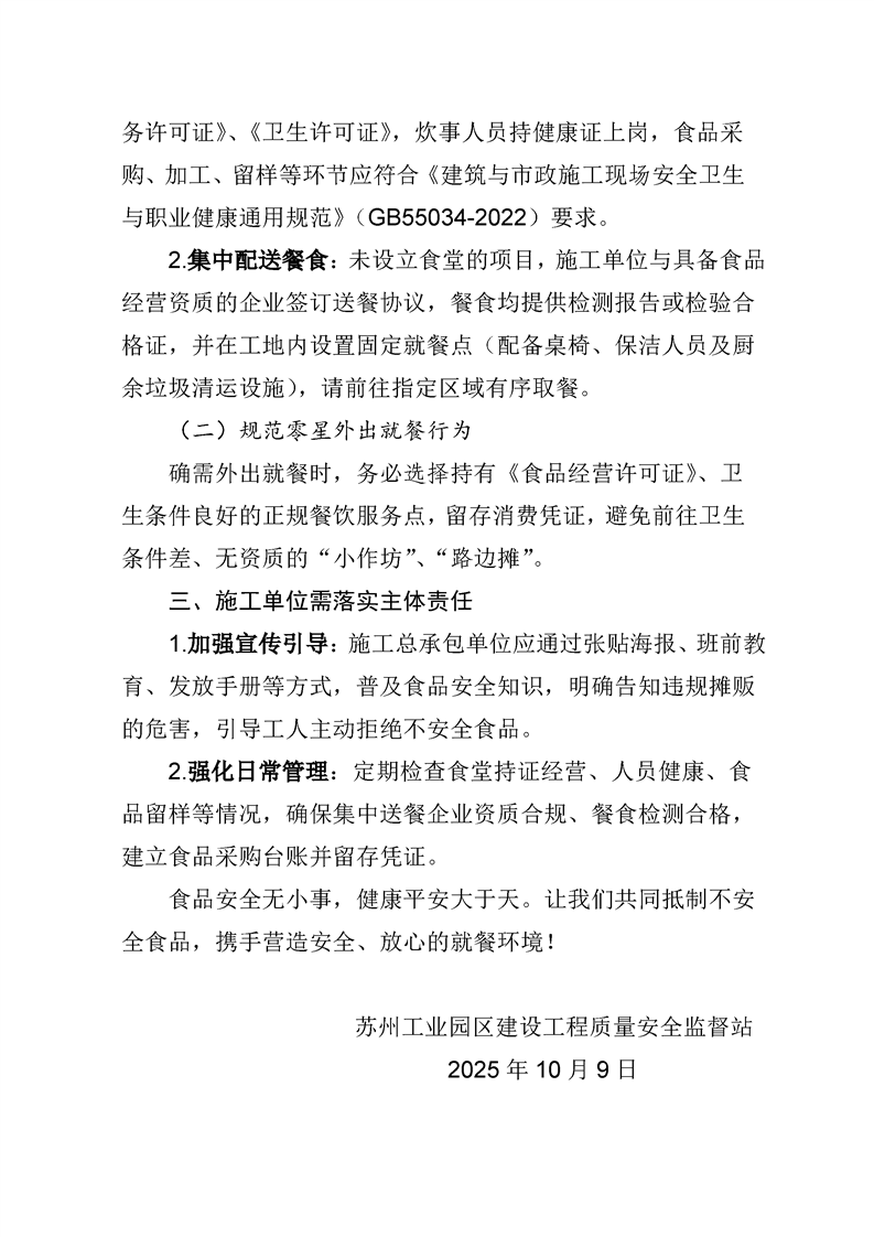 蘇州工業園區建筑工地食品安全提示函