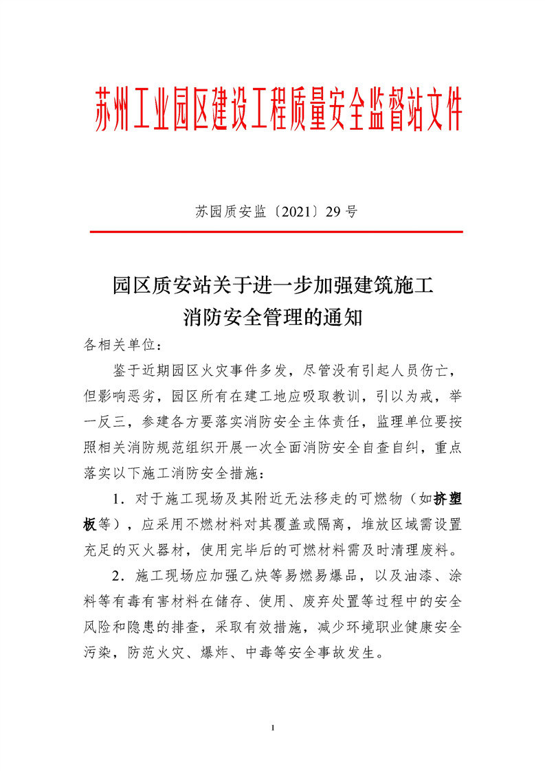 園區質安站關于進一步加強建筑施工消防安全管理的通知