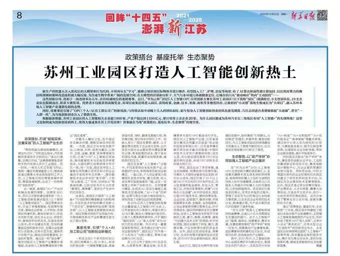 12月22日,《新華日?qǐng)?bào)》聚焦蘇州工業(yè)園區(qū),“政策搭臺(tái) 基座托舉 生態(tài)聚勢(shì)”,打造人工智能創(chuàng)新熱土。