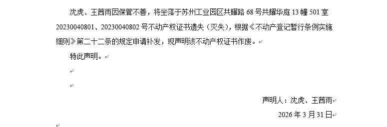 關于蘇州工業園區共耀路68號共耀華庭13幢501室20230040801、20230040802號不動產權證書遺失聲明
