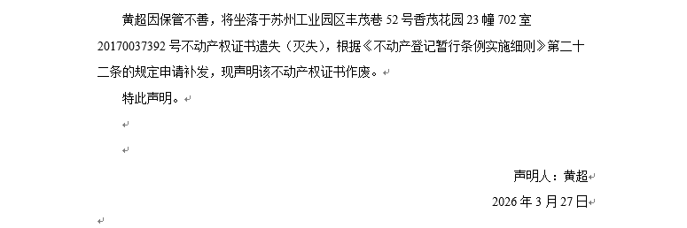 關于蘇州工業園區豐茂巷52號香茂花園23幢702室20170037392號不動產權證書遺失聲明