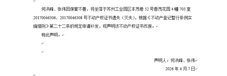 關(guān)于蘇州工業(yè)園區(qū)豐茂巷52號香茂花園4幢703室20170046306、20170046308號不動產(chǎn)權(quán)證書遺失聲明