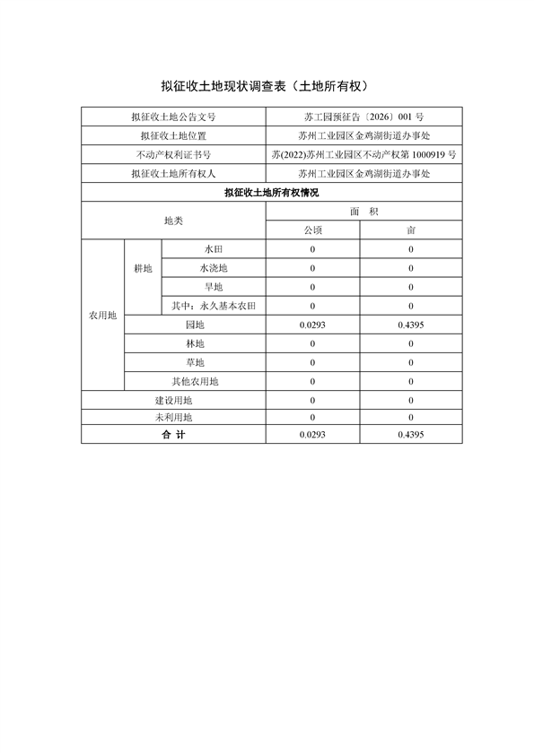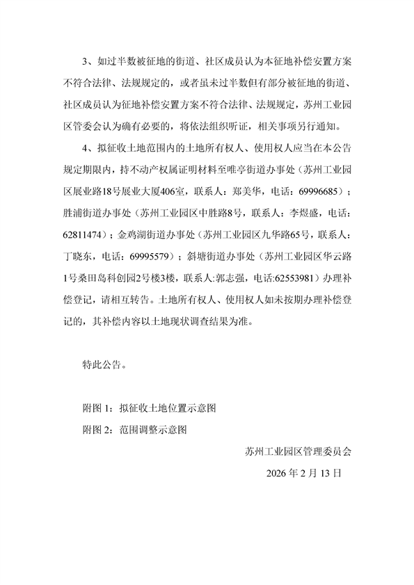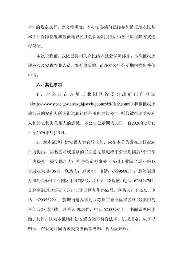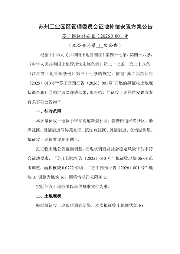 蘇州工業(yè)園區(qū)管理委員會(huì)征地補(bǔ)償安置方案公告(蘇工園征補(bǔ)安置〔2026〕001號(hào))