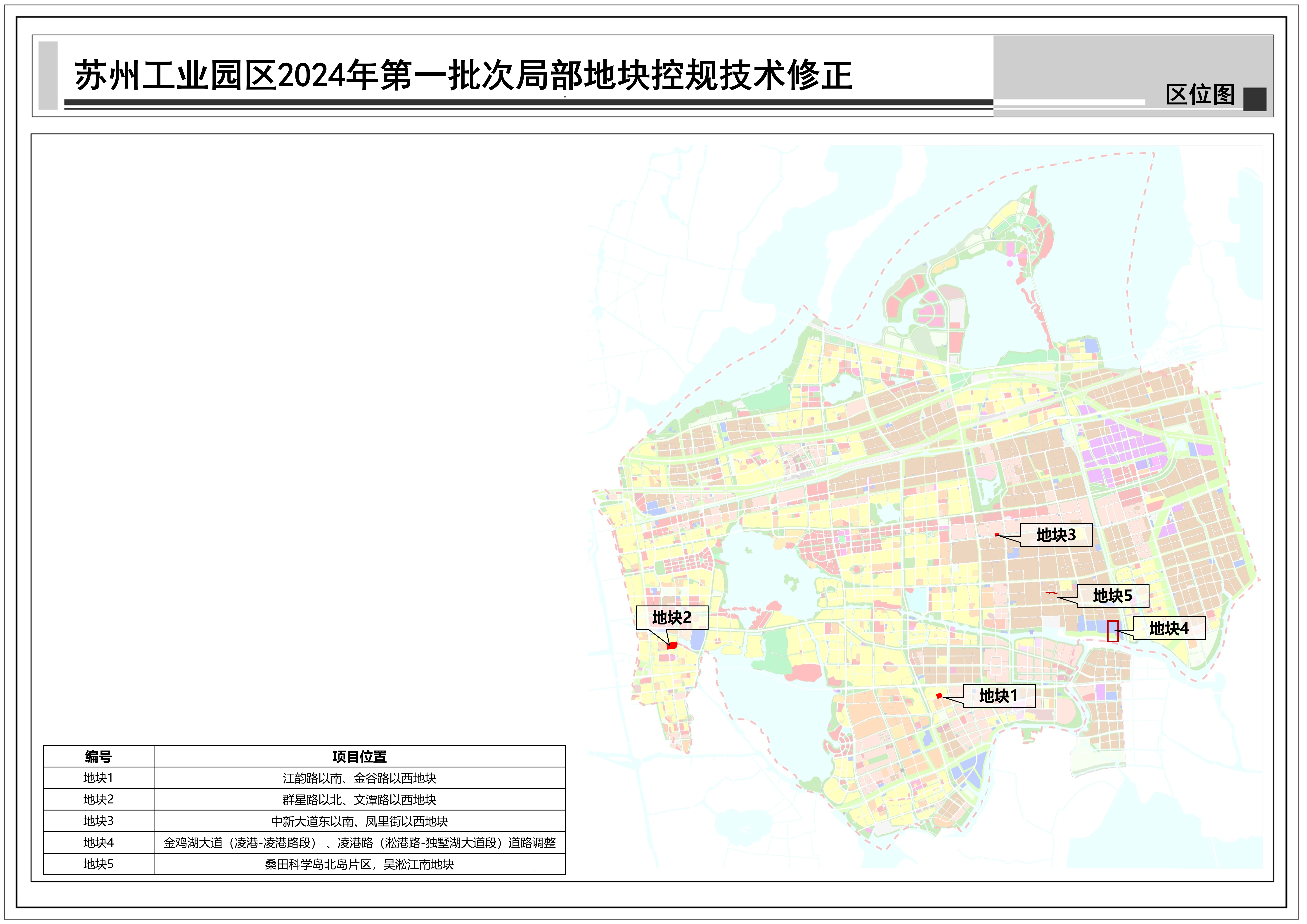 蘇州工業(yè)園區(qū)2024年第一批次局部地塊控規(guī)技術(shù)修正:共包括5個(gè)地塊,總用地面積約0.13平方公里,詳見附圖區(qū)位圖。