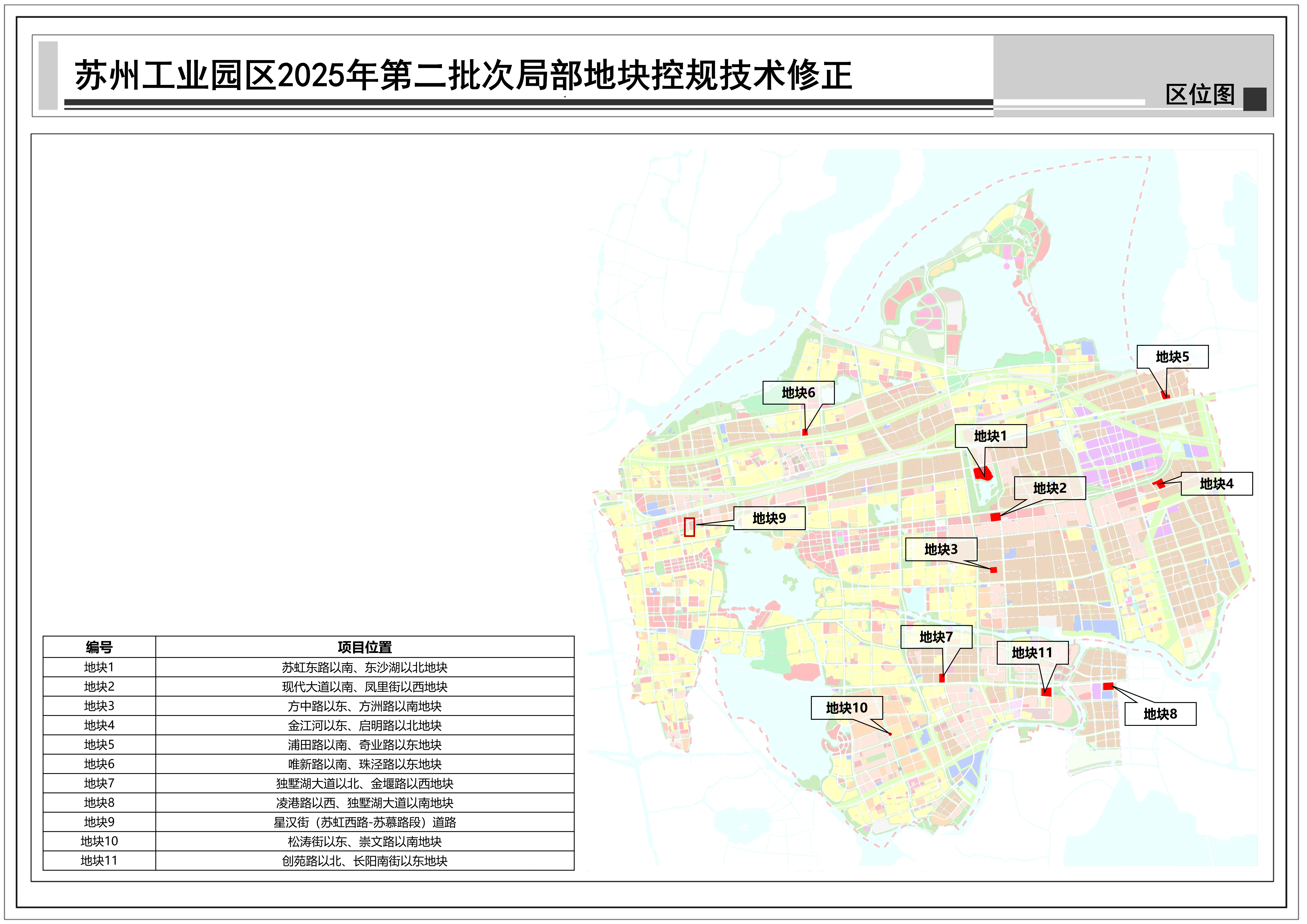 蘇州工業園區2025年第二批次局部地塊控規技術修正:共包括11個地塊,總用地面積約0.75平方公里,詳見附圖區位圖。