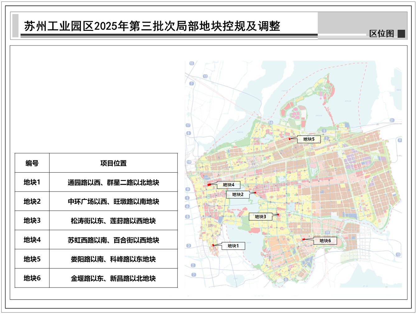 蘇州工業(yè)園區(qū)2025年第三批次局部地塊控規(guī)調(diào)整:共包括6個(gè)地塊,總用地面積約0.18平方公里,詳見附圖區(qū)位圖。