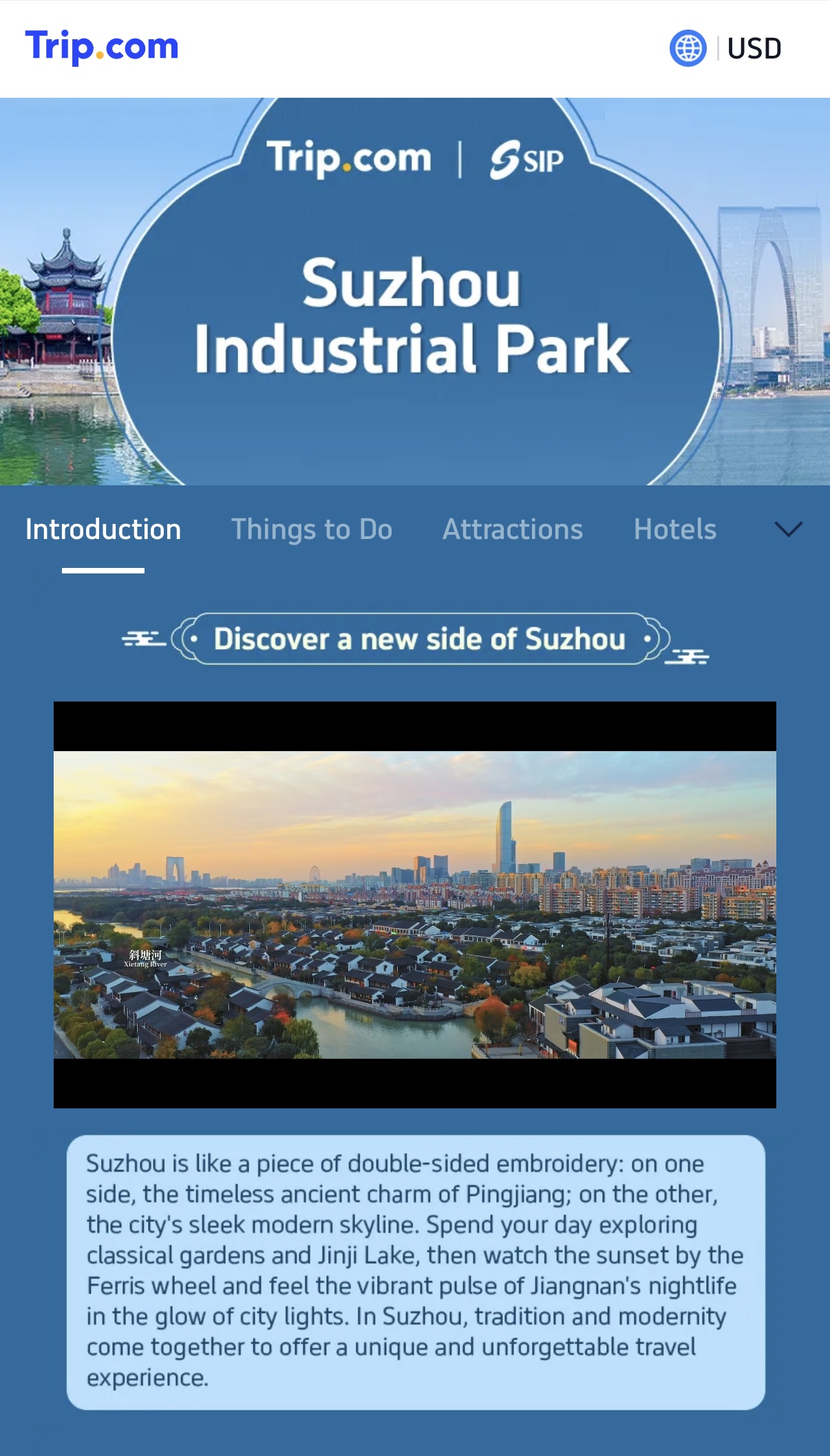 蘇州工業園區の海外特集ページは、5つの主要セクションで構成されている。動畫、寫真、文章、ワンクリック予約などの形式を通じて、言語や文化の壁を取り払い、世界中の旅行者が特集ページで公式情報を迅速に入手し、獨自の蘇州旅行プランを立て、「古今融合」の沒入型體験を気軽に始められる。旅行者は攜程(シートリップ)の海外プラットフォームにログインし、「SuzhouIndustrialPark」蘇州工業園區海外特集ページにアクセスするだけで、専用の旅をワンクリックで予約できる。