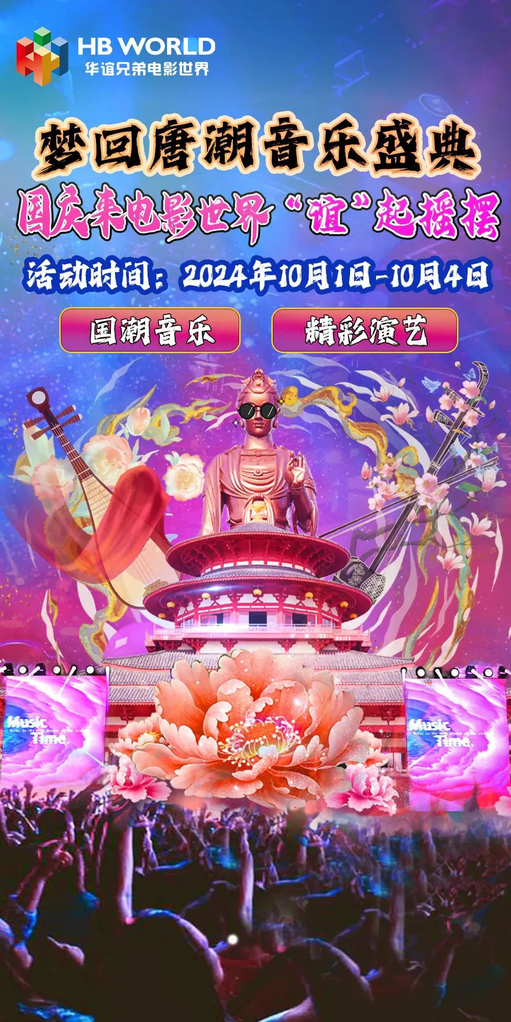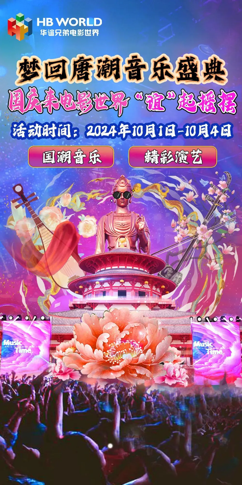 10月1日至4日,華誼兄弟電影世界帶來了“夢回唐潮音樂盛典”。每天50場+演出,紅紅火火迎國慶,現場唐樂演奏、國潮DJ、鼓踏飛燕熱鬧非凡!更有20+游樂設施免費游玩包你值回票價!