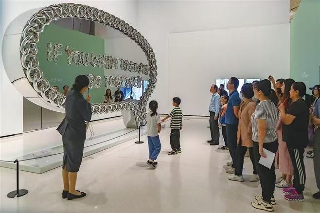 “華獅藝錦——中國·新加坡當(dāng)代藝術(shù)三十年”正在金雞湖畔的蘇州當(dāng)代美術(shù)館熱展,作品集納了兩國藝術(shù)家作品近百件。圖為昨日美術(shù)館講解員正在為觀眾講解。