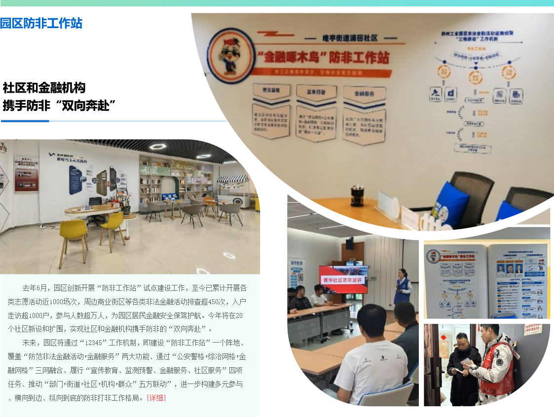 今年6月是第13個全國防范非法集資宣傳月,6月16日,蘇州工業園區舉行2025年防范非法金融活動集中宣傳日活動。現場,園區金融風險防控系統正式上線,20個防非工作站新設和擴圍,進一步深化金融普法教育,推動“防非”宣傳教育工作落地生根、開花結果。防范非法金融活動宣傳教育工作是維護金融秩序穩定、保障金融穩健運行的重要基石。作為區域金融高地,園區堅持線上線下統籌推進,筑牢防范非法集資的社會防線。線上,動態監測全域企業,提高風險識別科學性和準確性,逐漸形成“底數清、責任明、發現早、處置快”一網縱觀全局的智能神經中樞;線下,深化“防非工作站”內涵,用好金融“鄰”距離系列活動資源,同時積極發動1.7萬... [詳細]
