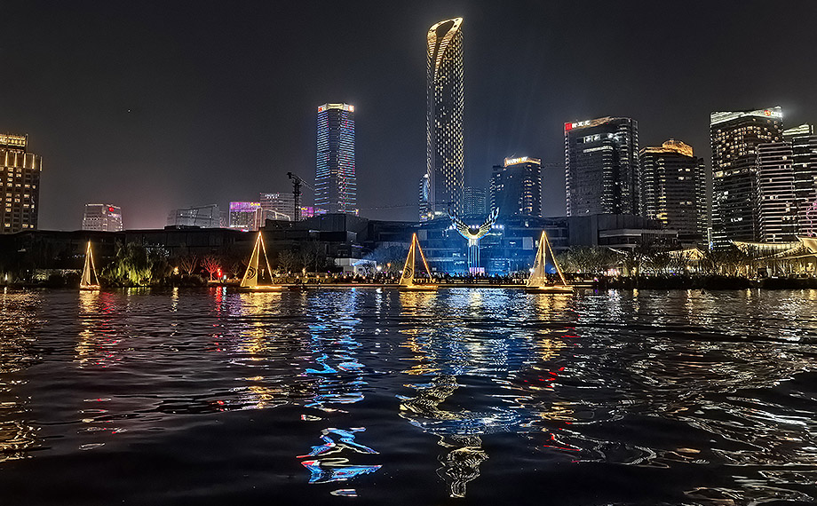 浪漫的不只有右岸的舞臺,還有湖中流動的月光詩篇。夜幕之下,數(shù)艘?guī)Я粱b飾的帆船、微游艇以及夜光槳板,在金雞湖右岸客廳前的水域悠然游弋。船影輕搖,燈火蕩漾,與岸上的歌聲、天上的明月交相輝映,共同織就一幅唯美的中秋畫卷,將團圓浪漫定格在每位市民游客心中。