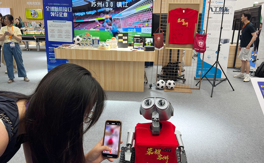展會(huì)現(xiàn)場(chǎng),人工智能應(yīng)用也與“蘇超”隔空對(duì)話。在蘇超互動(dòng)區(qū),曾作為蘇超機(jī)器人領(lǐng)隊(duì)并在中場(chǎng)表演中展示魅力的明星機(jī)器人WAWA一邊移動(dòng)一邊擺動(dòng)手臂,與圍觀人群熱情互動(dòng)。
