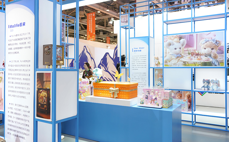 從國潮盲盒到AI玩具,從治愈IP到硬核科技——在園區展廳內,文創設計的多元面貌正以生動可感的方式集中呈現。若態科技帶來旗下三大品牌產品線,涵蓋木質拼接玩具、國風盲盒與機械傳動模型。其全新IP“YOZCO柚可”首次線下亮相,肉桂色長發與小鹿般清澈的眼睛,散發著溫暖治愈的氣息,吸引不少年輕人駐足拍照。同期展出的“YeeDeer原野小鹿”系列,以“情緒修補小精靈”為設定,進一步傳遞出文創IP在情感連接上的深度探索。