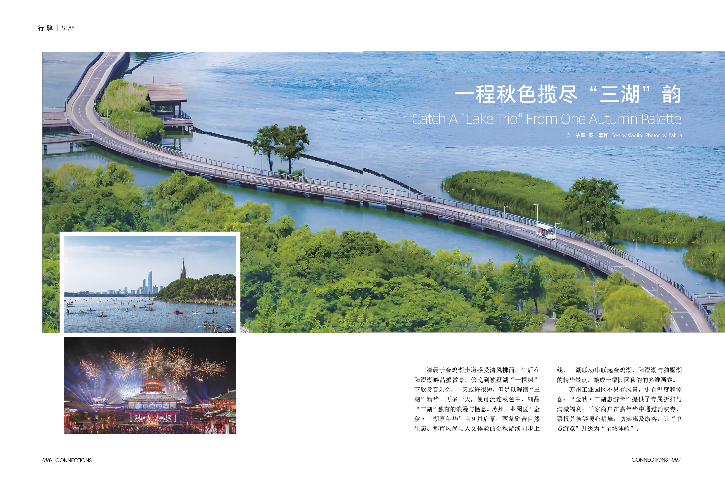 在本期《東方航空》雜志中,蘇州工業(yè)園區(qū)的三湖秋色一覽無(wú)余。文章通過(guò)“浪漫金雞湖的歸心旅途”、“蟹肥秋濃,滿澄盡啖黃金甲”、“蕩起雙槳,獨(dú)墅湖涌動(dòng)青春活力”三個(gè)板塊,將園區(qū)的秋韻花卷娓娓道來(lái)。它向讀者呈現(xiàn)了金雞湖的都市繁華、陽(yáng)澄湖的肥美湖鮮,以及獨(dú)墅湖的青春活力,讓東航國(guó)際國(guó)內(nèi)旅客在高空閱讀中,感受到蘇州工業(yè)園區(qū)的開(kāi)放、友好與活力。