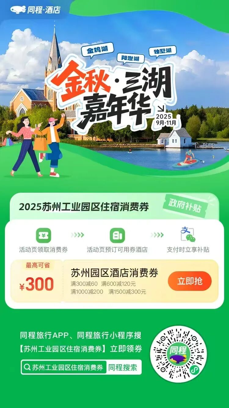 在住宿文旅領(lǐng)域,園區(qū)聯(lián)合同程旅行平臺(tái)發(fā)放百萬(wàn)級(jí)住宿消費(fèi)紅包,市民游客登錄同程旅行APP或小程序,搜索“金秋?三湖嘉年華”進(jìn)入專題頁(yè)面即可一鍵領(lǐng)取住宿文旅消費(fèi)券,在活動(dòng)頁(yè)預(yù)訂可用券酒店,支付時(shí)立享補(bǔ)貼,最高可減300元。
