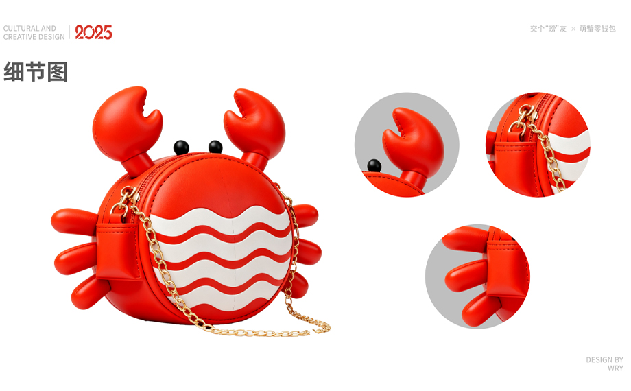 該作品以傳統“蟹八件”為靈感,打造了一套涵蓋毛絨掛件、健康錘、化妝鏡等八件蟹主題系列作品。運用“有鉗”諧音,衍生出“馬上有鉗、有鉗有好運、身體就是本鉗”等系列正能量口號,將美好的祝福融入日常生活的每個角落。