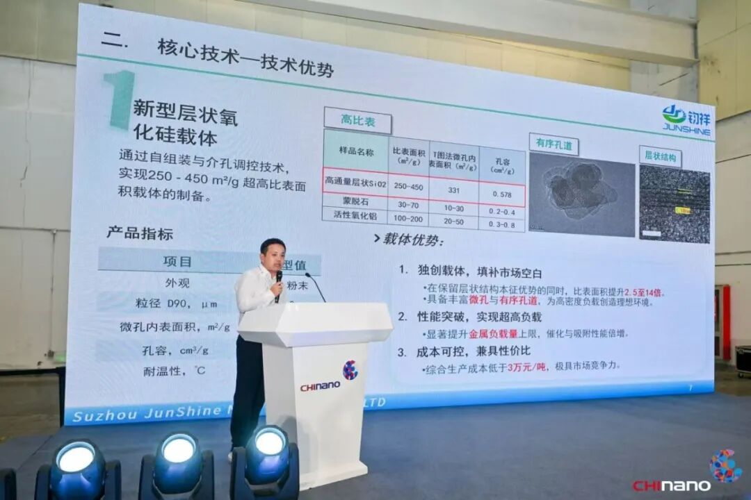 蘇州鈞祥新材料有限公司技術總監徐黎明,帶來了主題《高通量負載的層狀氧化硅納米材料》的分享。他介紹道:其公司研發的高通量負載層狀氧化硅納米材料,突破了傳統金屬納米粒子負載技術瓶頸,具備超高比表面積和有序孔道結構,實現了金屬納米顆粒的高負載與均勻分散,有效解決了高溫燒結與團聚等行業痛點。該材料在無機抗菌、高效催化、電磁屏蔽、鋰電隔膜等領域展現出廣泛應用潛力,已通過多家單位試用并實現銷售,具有成本低、性能優、可定制等優勢,為推動納米材料產業化發展提供了關鍵支撐。