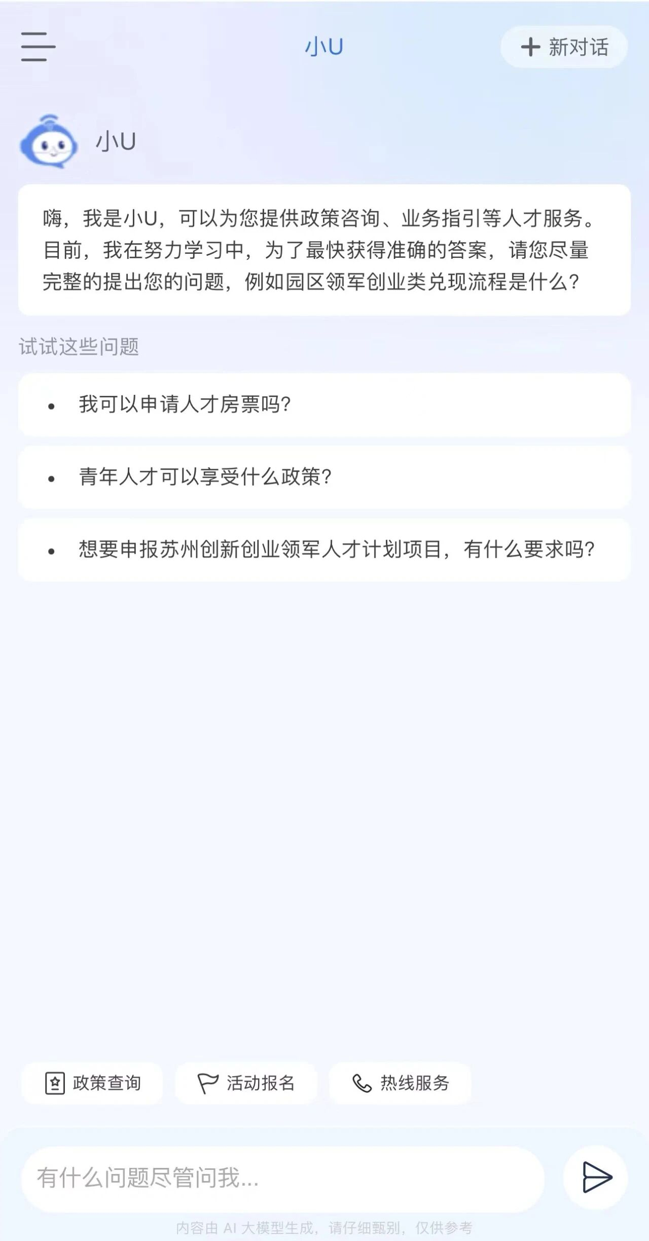 自2025年上線以來(lái),“小U”已累計(jì)提供對(duì)話服務(wù)6107次,平臺(tái)瀏覽量達(dá)8.2萬(wàn)次,服務(wù)訪客超2萬(wàn)人,構(gòu)建起“政策秒配、服務(wù)無(wú)界”的智能化人才服務(wù)體系。