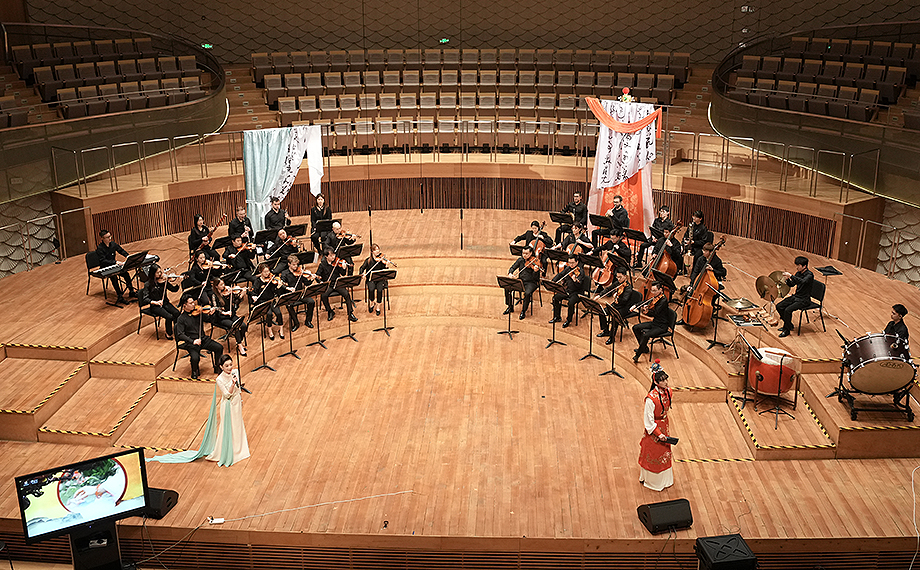“演出采用‘雙講述人’的結(jié)構(gòu)——其中歐陽奮強的講述可以喚醒集體記憶,青年寶玉則與交響樂手共同形成《紅樓夢》故事的經(jīng)歷者,雙重敘事交織,層層遞進。”《紅樓夢·回響》編劇徐李佳表示,以交響樂這種世界性的藝術(shù)形式來表現(xiàn)中國經(jīng)典,這本身就形成了新的藝術(shù)表達。希望通過耳熟能詳?shù)男桑档徒豁憳返男蕾p門檻,讓更多觀眾走進音樂廳。