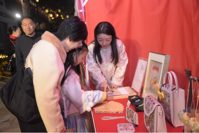 在仁和織繡的攤位前,來自北京的沈女士正帶著女兒一起體驗。沈女士的女兒在學習京劇,特別喜歡傳統文化和非遺?!拔覀冎霸诓┪镳^見過緙絲,但不了解具體工藝?,F場準備了緙絲小教具,我們可以親自動手體驗,看著一根根絲線最終形成畫面,特別有成就感。”對于緙絲體驗,沈女士頻頻點贊。