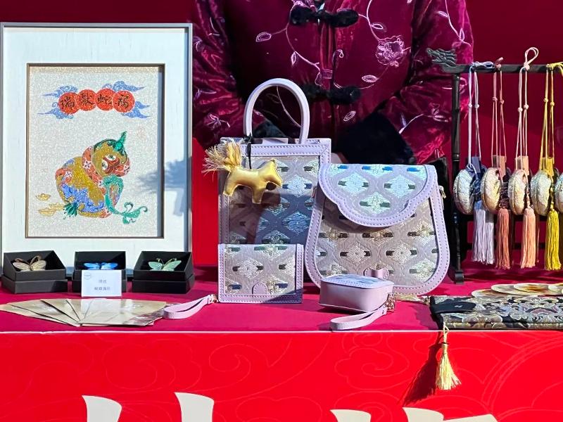 “這幅作品是福蛇獻(xiàn)瑞,采用緙繪結(jié)合的工藝,不僅寓意好,還是藝術(shù)跨界。這款蝴蝶胸針,采用緙絲面料、盤扣工藝,是兩項非遺技藝的結(jié)合體。這組紫色包具,設(shè)計時尚典雅,用的則是西陣織面料,也是非常珍貴的織造技藝!……”展位前,仁和織繡總經(jīng)理、高級工藝師謝晴容細(xì)數(shù)家珍,為市民游客介紹著產(chǎn)品特色和織造工藝。