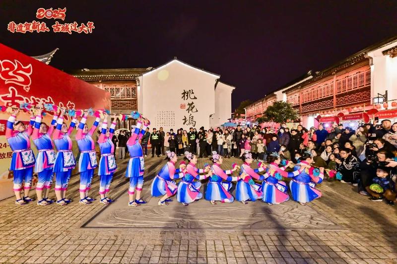 在桃花塢古色古香的背景映襯下,來自園區(qū)勝浦街道的“浦韻非凡連廂隊”隊員們也為市民游客奉獻(xiàn)了一場精彩絕倫的打連廂表演《圓融》。