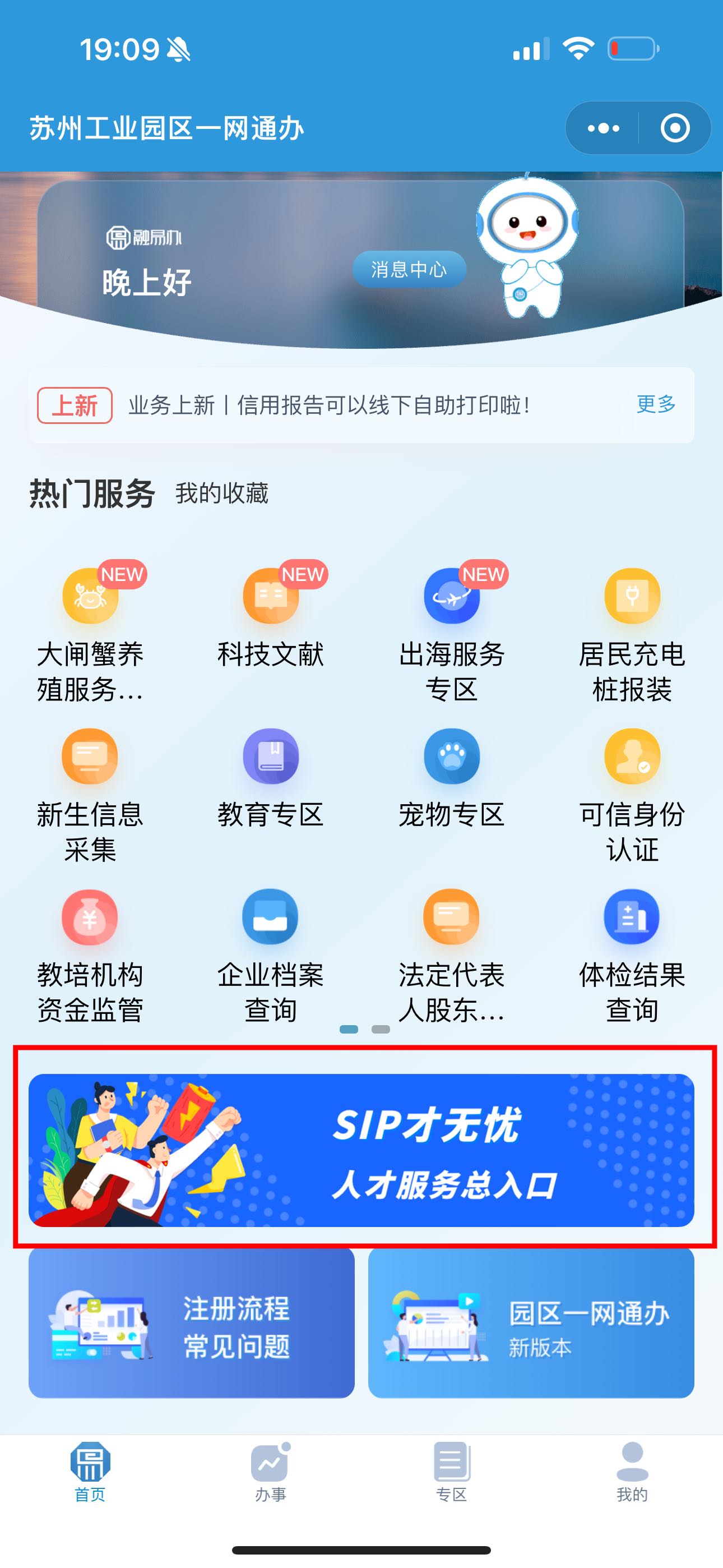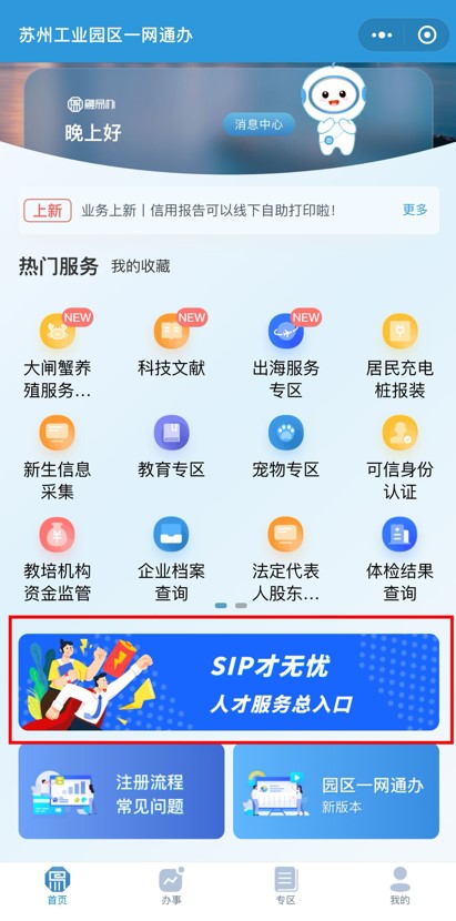 方式二:關注“蘇州工業園區發布”微信公眾號,點擊下方“一網通辦”菜單欄,進入后點擊“SIP才無憂”人才服務總入口。