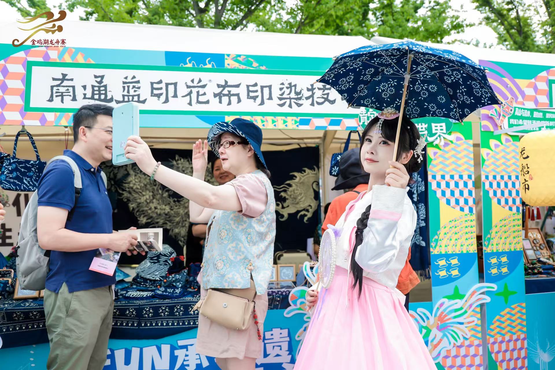 今年,園區(qū)圍繞五大主題板塊,精心布置60余個(gè)非遺展位,以“靜態(tài)展陳、動(dòng)態(tài)展演、活態(tài)傳承”為核心,傾力打造出古今交融的——“FUN承非遺·金雞湖龍船市”。這里匯聚了7項(xiàng)人類非遺、16項(xiàng)國(guó)家級(jí)非遺、24項(xiàng)省/市/區(qū)級(jí)非遺項(xiàng)目,還有20項(xiàng)由高校團(tuán)隊(duì)、品牌主理人、海外藝術(shù)家及青年創(chuàng)藝家的跨界共創(chuàng)的特色內(nèi)容。非遺傳承人與創(chuàng)意先鋒們?cè)诖私涣髑写瑁層慰驮趫@區(qū)解鎖端午新風(fēng)尚。