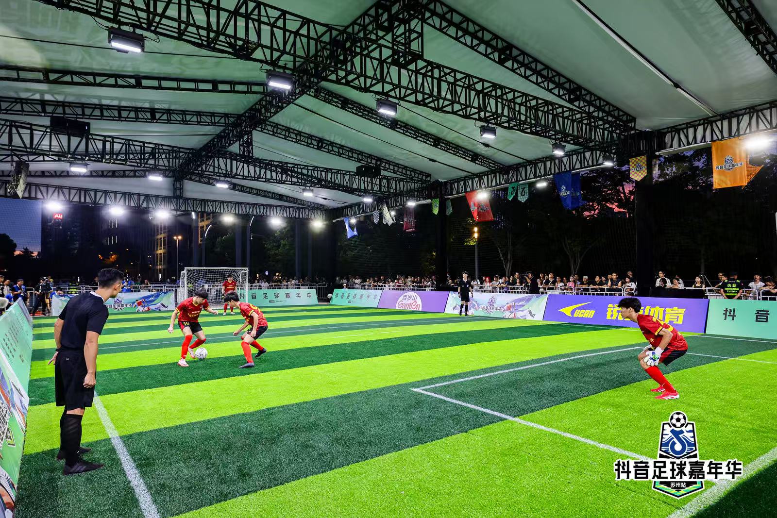 6月27日晚,抖音足球嘉年華蘇州站1v1挑戰賽在蘇州工業園區世紀廣場火熱上演,活動巧妙融合傳統蹴鞠文化與現代足球競技,吸引眾多市民現場參與,帶來了一場集激烈賽事、趣味互動和精彩表演于一體的夏日足球盛宴。