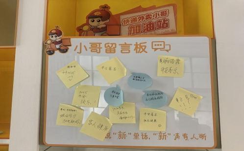 這里召開了“就業群體座談會”,通過面對面與美團、餓了么、叮咚買菜等小哥交流,了解他們的實際需求等??蛷d內設置有“小哥留言板”,讓您心煩可傾訴、“新”聲有人聽。