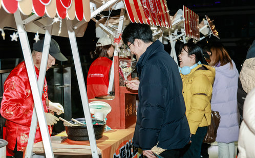 非遺美食區(qū)的煙火氣,妥妥拿捏了年輕人的味蕾。糖畫、冰糖葫蘆、海棠糕、吹糖人、赤豆小圓子五大傳統(tǒng)美食現(xiàn)場制作,香氣直撲鼻腔,吸引大批青年排隊(duì)兌換。糖畫攤主手持糖漿壺,手腕輕轉(zhuǎn)間,龍、鳳、小兔子等可愛造型躍然板上,年輕人圍在一旁舉著手機(jī)拍攝,拿到專屬糖畫立刻打卡分享;冰糖葫蘆攤位前,晶瑩糖衣裹著新鮮山楂,酸甜口感瞬間喚醒童年記憶,成為青年們的懷舊必選;海棠糕、赤豆小圓子香味撲鼻,驅(qū)散了夜晚涼意,暖心又暖胃。這些美食不僅滿足味蕾,更讓年輕人在品嘗中解鎖傳統(tǒng)風(fēng)味的新潮打開方式,感受民俗文化的溫度。