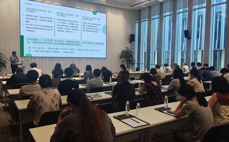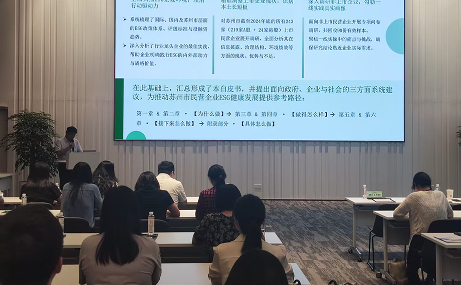 活動上,園區城市發展研究院分享了ESG發展近況及園區ESG領域的特色亮點,展示了ESG公共服務平臺的相關功能模塊。蘇州市企業可持續發展聯合會介紹《蘇州市民營企業ESG發展白皮書》,圍繞白皮書編制背景與核心內容進行解讀。