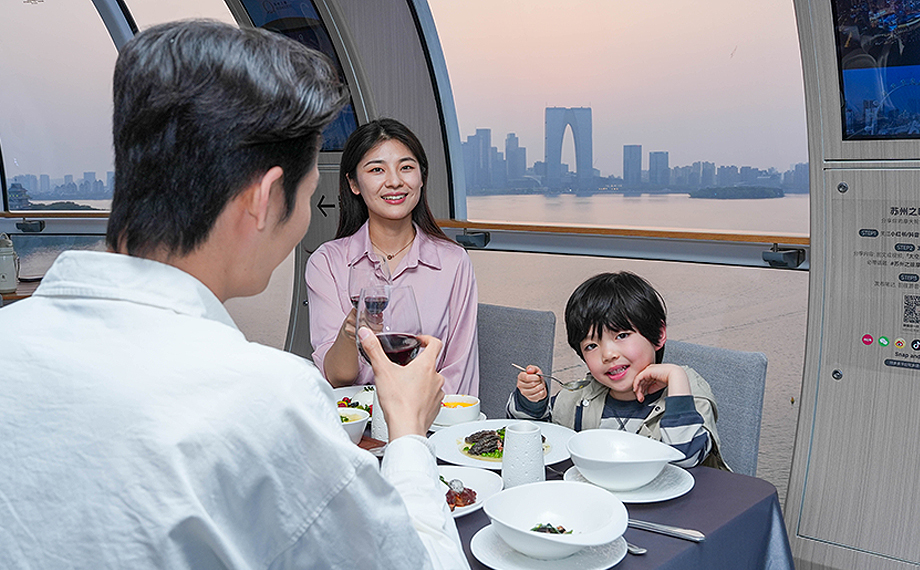 事實上,“甜蜜”不只屬于情侶。在園區(qū)“甜蜜經(jīng)濟(jì)”品牌框架下,“蘇州之眼”不斷豐富其產(chǎn)品體系,創(chuàng)新推出“門票+”產(chǎn)品系列,將摩天輪與餐飲、酒店、商業(yè)、水上游覽深度融合——帶上家人,來一場“蘇州之眼+酒店”的周末微度假;約上三五好友,體驗“摩天輪+水上游覽”半日浪漫游;又或是一個人,在云端艙里安靜地看一場日落……每一次登艙,都是一次浪漫微旅行。