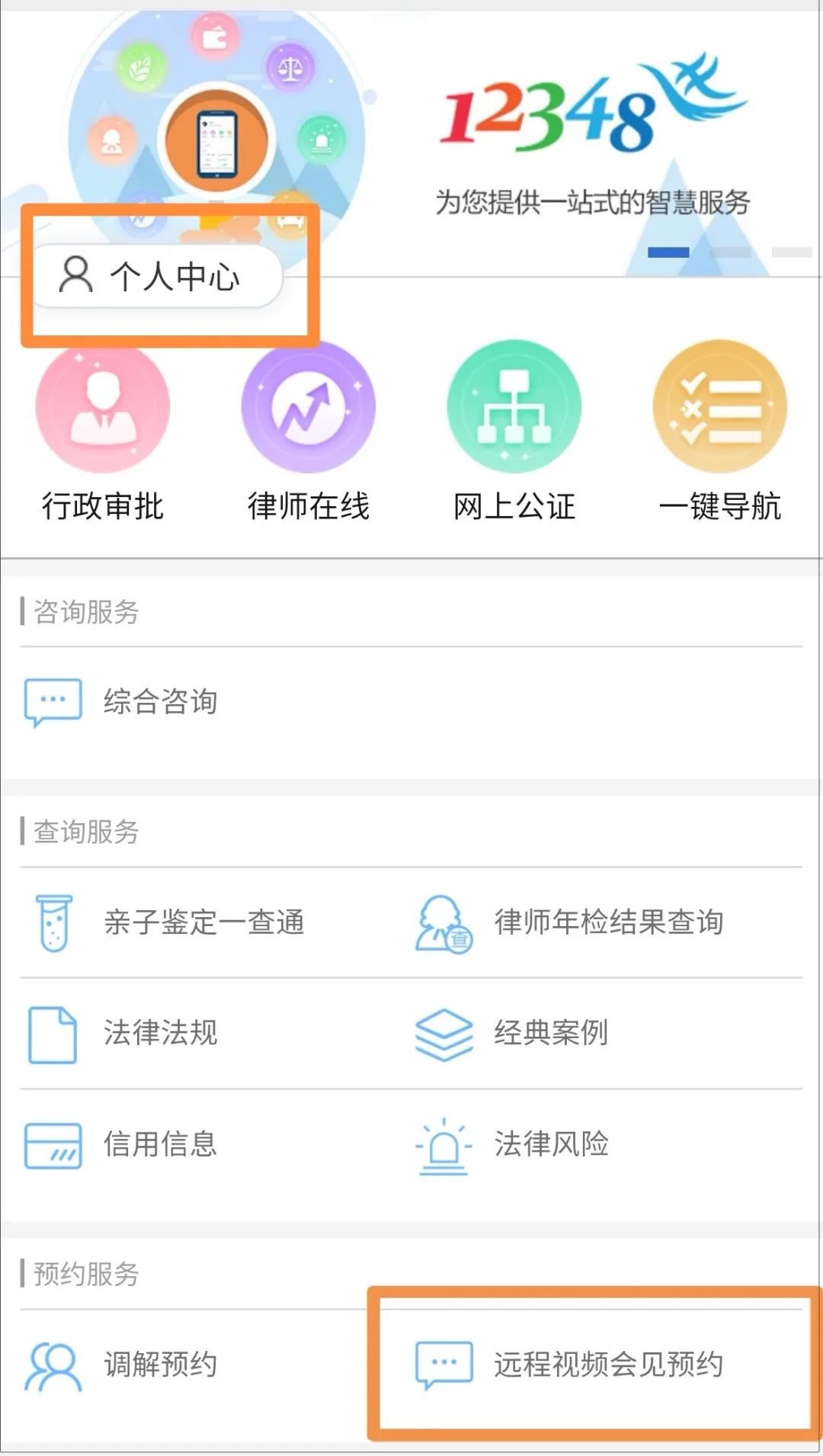 第二步:進入公眾號后,點擊頁面底端“法律服務”,新用戶需要先點擊左上角的“個人中心”進行注冊。注冊后,在法律服務頁面“預約服務”板塊點擊“遠程視頻會見預約”。