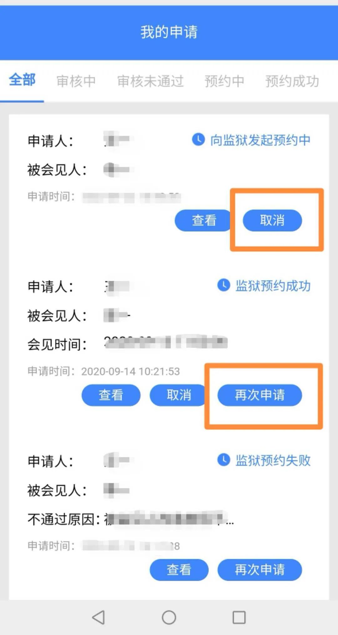 服刑人員家屬因故需要取消會見的,需在“我的申請”中進行“取消”會見操作、寫明原因,同時電話致電工作人員取消會見,以便工作人員及時與監獄對接。向監獄預約成功后,會見申請人無故取消會見的,半年內不再安排遠程視頻會見。