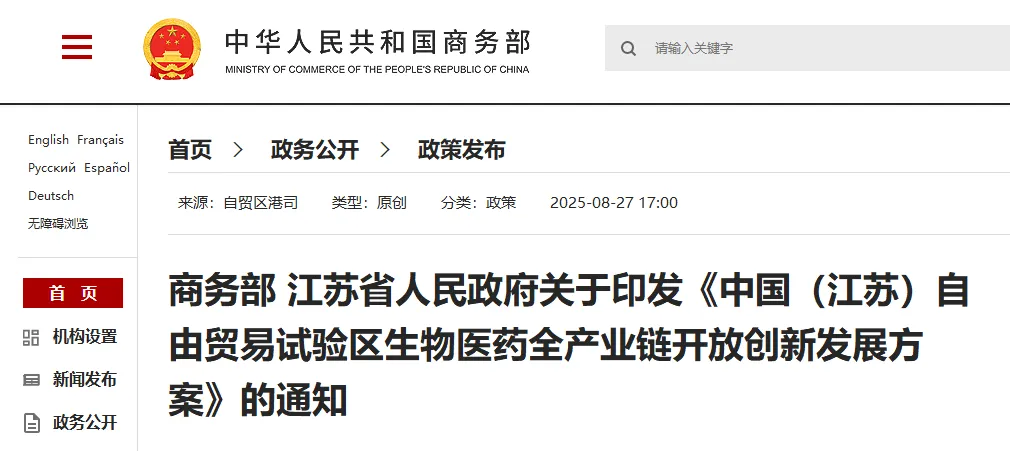 2025年8月,經(jīng)國務(wù)院同意,商務(wù)部和江蘇省人民政府聯(lián)合印發(fā)江蘇自貿(mào)區(qū)生物醫(yī)藥全產(chǎn)業(yè)鏈創(chuàng)新發(fā)展方案。江蘇成為全國第一個獲批生物醫(yī)藥領(lǐng)域試點(diǎn)的省份。針對方案,江蘇省人民政府也印發(fā)了專項(xiàng)實(shí)施方案,包含77項(xiàng)政策舉措。目前,蘇州自貿(mào)片區(qū)已推進(jìn)31項(xiàng)政策落地見效。