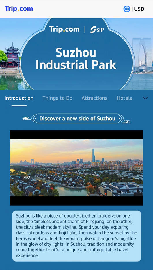 SIP formally unveiled a webpage on Trip.com on Mar 18, showcasing its attractions to international tourists.