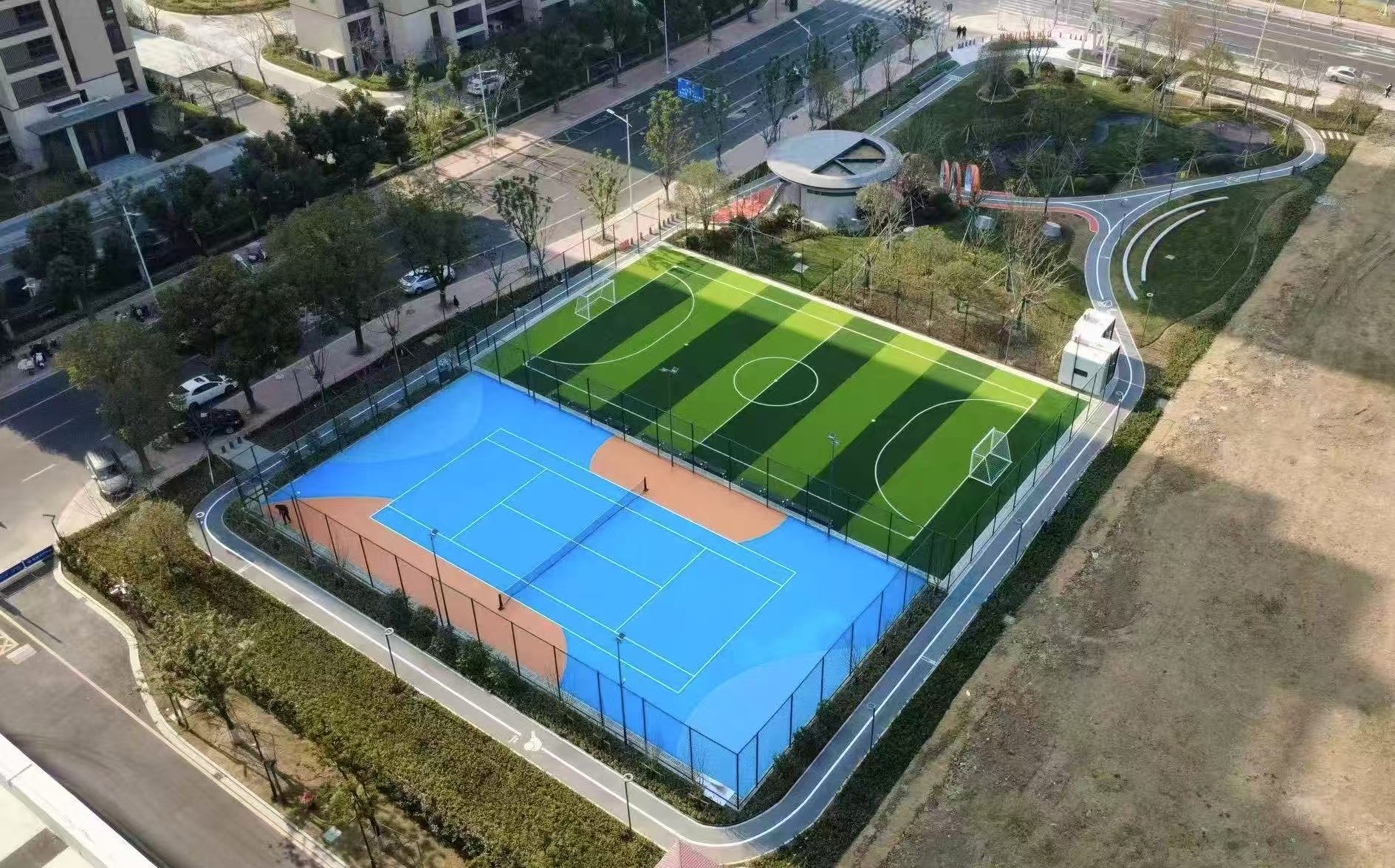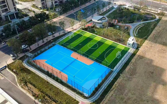 Outdoors, there are tennis and football courts embedded in a park, creating a vibrant healthy living ecosystem for people of all ages.