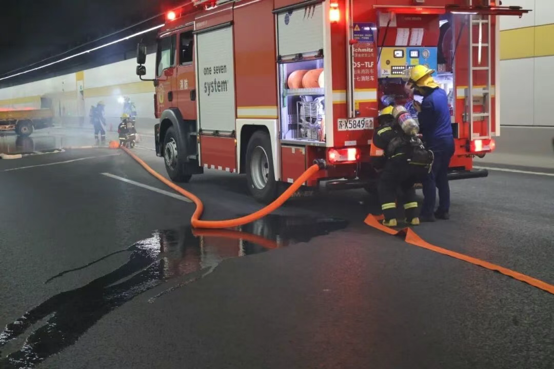 市政服務集團隧道管理中心通過監控系統確認險情后,立即啟動應急機制,同步完成火警上報、力量集結和警示廣播。應急保障隊伍60余人聞令而動,兵分三路展開救援:疏散組引導被困人員沿應急通道安全撤離;引導組在隧道出入口實施交通疏導,開辟救援生命通道;救援組開展前期消防處置,有效控制火勢蔓延。金雞湖消防大隊接警后迅速抵達現場,專業開展水源接管、火場降溫與明火撲救作業。交警部門同步實施隧道內外交通管制,保障救援通道高效暢通。