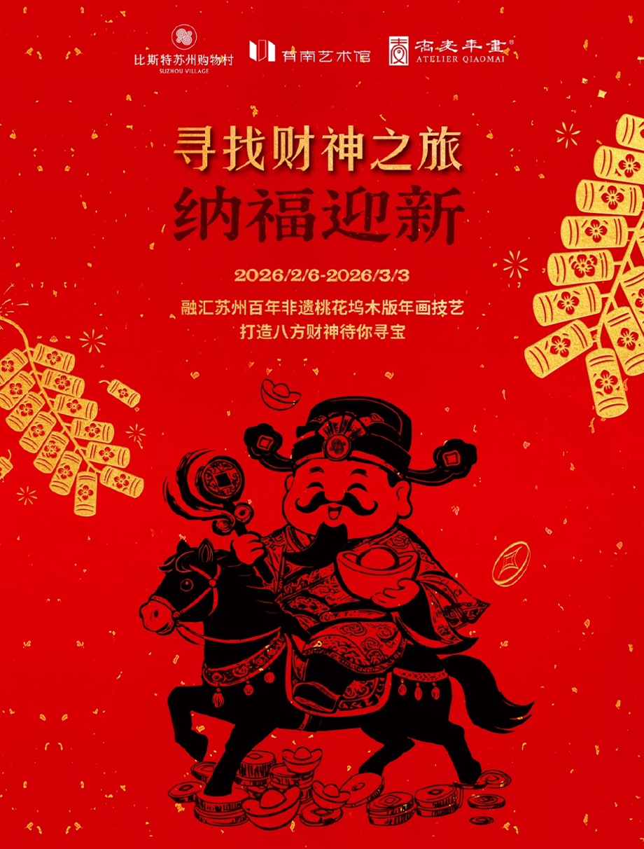 “尋財神,納福禮”非遺打卡活動火熱進行中!比斯特蘇州購物村攜手蘇州百年非遺——桃花塢木版年畫傳承人喬麥及其工作室,共同打造八款限定財神形象,悄悄藏在購物村的各個角落,等待游客前往打卡。游客參與尋找并收集財神形象,可解鎖非遺好禮、拓印體驗;集齊所有財神,可參與線上抽獎;還有機會贏取足金禮品、有熊酒店房券、千元禮品卡等福利,讓大家在逛吃購的同時,帶走一份非遺文化帶來的福氣。