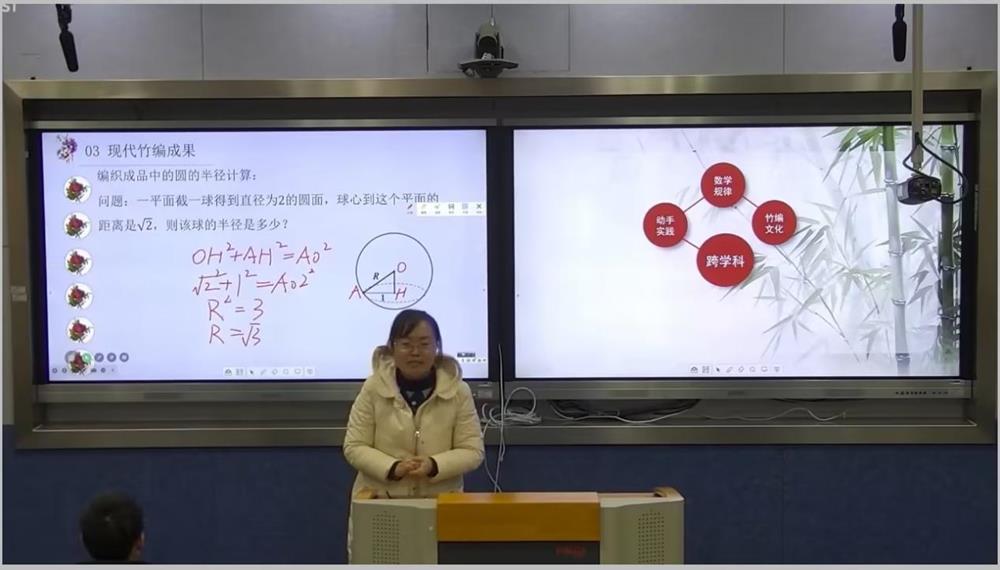 星海實驗初級中學張潔老師的《“編”千萬物,“數”萬古章》,項目以“非遺文化竹編”為學習情境,從三層探析、四階探究、五維育人等方面發展學生的綜合素養。張老師從非遺竹編的制作過程抽象出數學問題,學生在此過程靈活運用數學幾何圖形知識解決問題。整堂課在注重數學基本知識與技能的同時,逐步引導學生感悟非遺文化中數學與藝術的美。