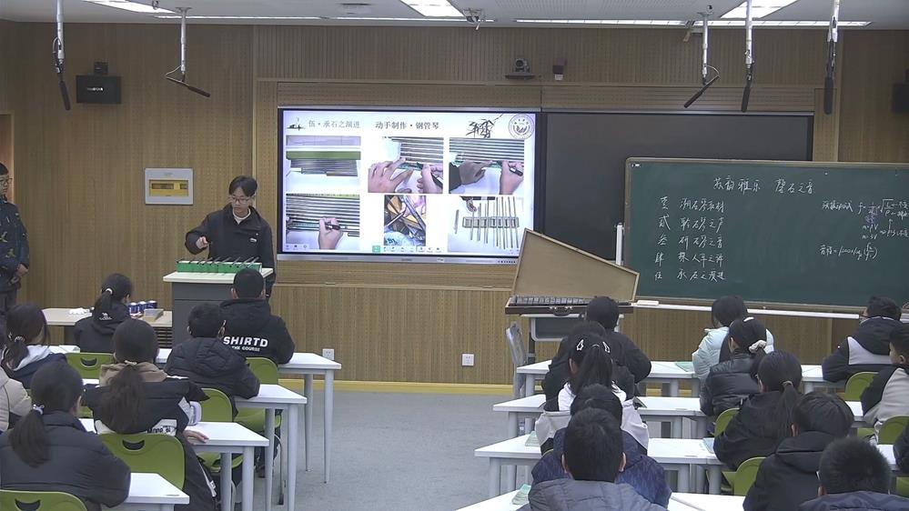 唯亭學校許計懿老師在項目《蘇韻雅樂·磬石之音》中,帶領學生探索古人以石制琴的原理。一曲石琴演奏,讓學生初步體悟石琴的聲色音調;從琴鍵構造出發,發現長度對音調的影響,通過實驗測量出具體數據,作圖驗證得出發聲原理弦振動公式中的弦密度為定值,且與弦長呈負相關;結合對數函數圖像,理解人耳對音程的對數翻譯過程;根據石琴的現代形態轉變,學生動手制作了由不銹鋼管、易拉罐為原材料的敲琴,將項目研究成果運用到具體實踐中,深刻感受數學知識在跨學科探究中的獨特魅力與實用價值。