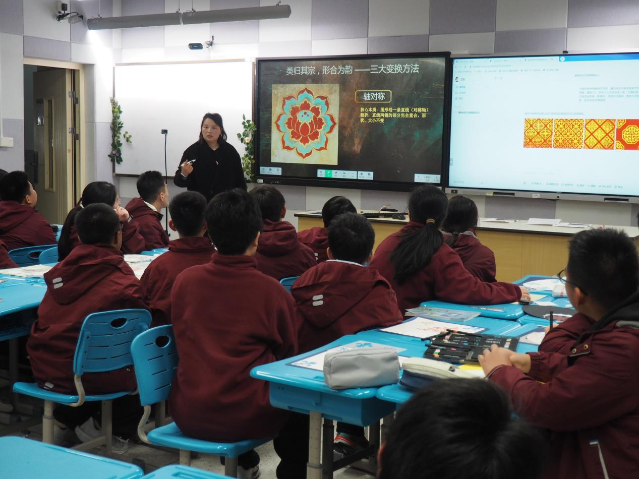 應用教學《綜合與實踐——古韻新生:圖形變換與傳統(tǒng)紋樣設計》:星浦實驗中學王歡老師通過對中國傳統(tǒng)回紋、寶相花紋、藻井紋等經(jīng)典紋樣構成規(guī)律的探究,進一步體會其背后所蘊含的平移、旋轉、軸對稱三大圖形變換的數(shù)學本質,讓學生學會用數(shù)學的眼光觀察傳統(tǒng)紋樣的對稱與秩序之美,用數(shù)學的思維分析紋樣的生成邏輯與變換原理,用數(shù)學的語言論證圖形的位置關系與結構特征,并借助AI互動小程序實現(xiàn)傳統(tǒng)紋樣的創(chuàng)作與生成,在實踐中感受數(shù)學與傳統(tǒng)文化、現(xiàn)代科技的融合之美。