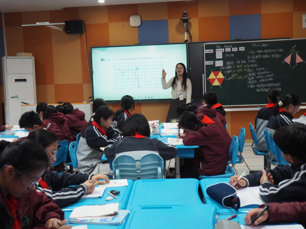規(guī)則教學《旋轉(1)》:景城學校郭雪婷老師以平移、軸對稱舊知引入,結合生活情境引導學生探究旋轉要素。學生們積極思考、主動互動,在圖形對應關系分析、正六邊形實例探究中踴躍發(fā)言,在有網(wǎng)格和無網(wǎng)格的旋轉作圖練習里認真實操,高效掌握旋轉核心特征。課堂通過類比探究,引導學生研究幾何圖形變換,既培養(yǎng)了學生的幾何作圖與邏輯思維能力,也為后續(xù)旋轉性質應用筑牢基礎。