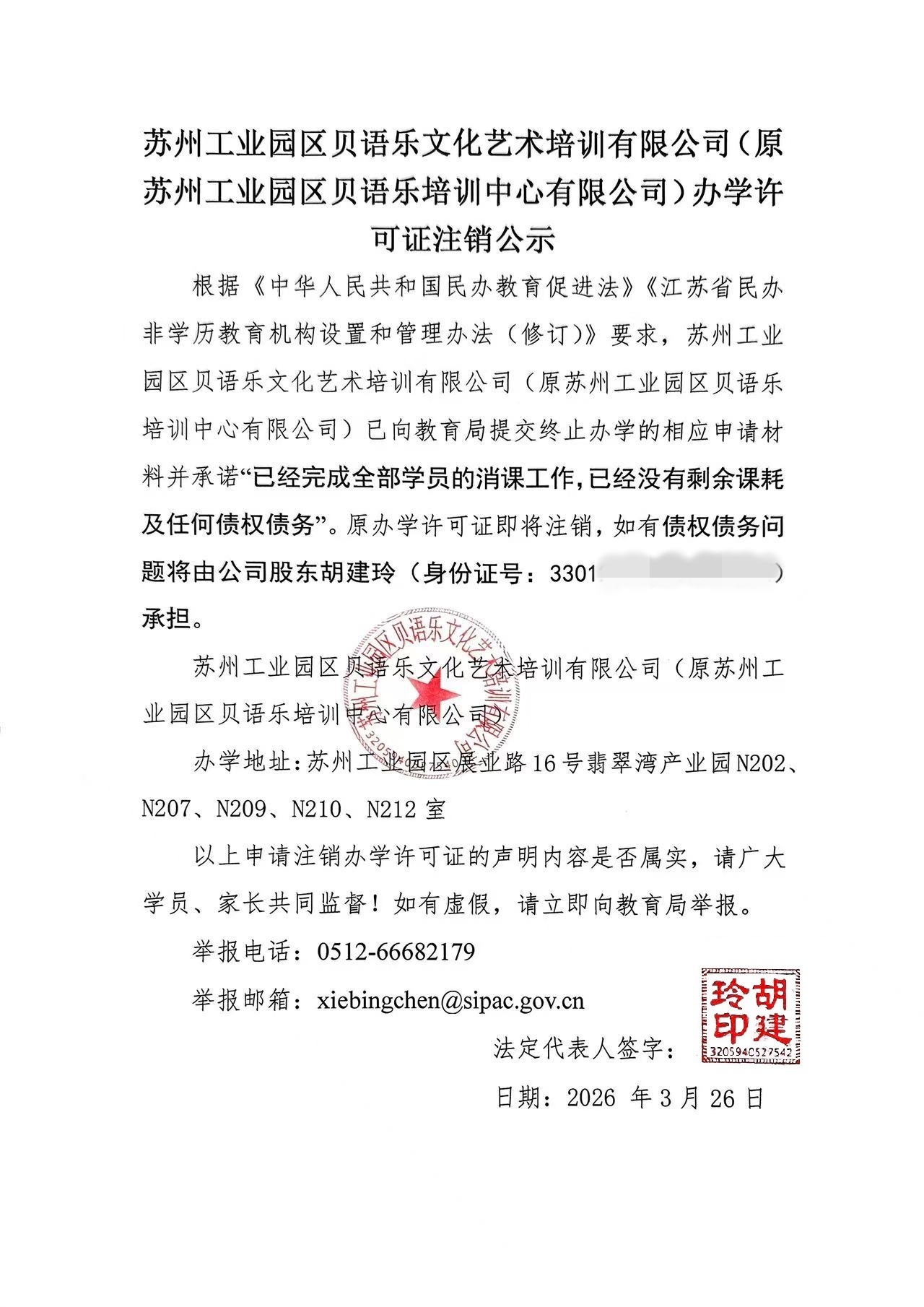 蘇州工業(yè)園區(qū)貝語樂培訓(xùn)中心有限公司辦學(xué)許可證注銷公示